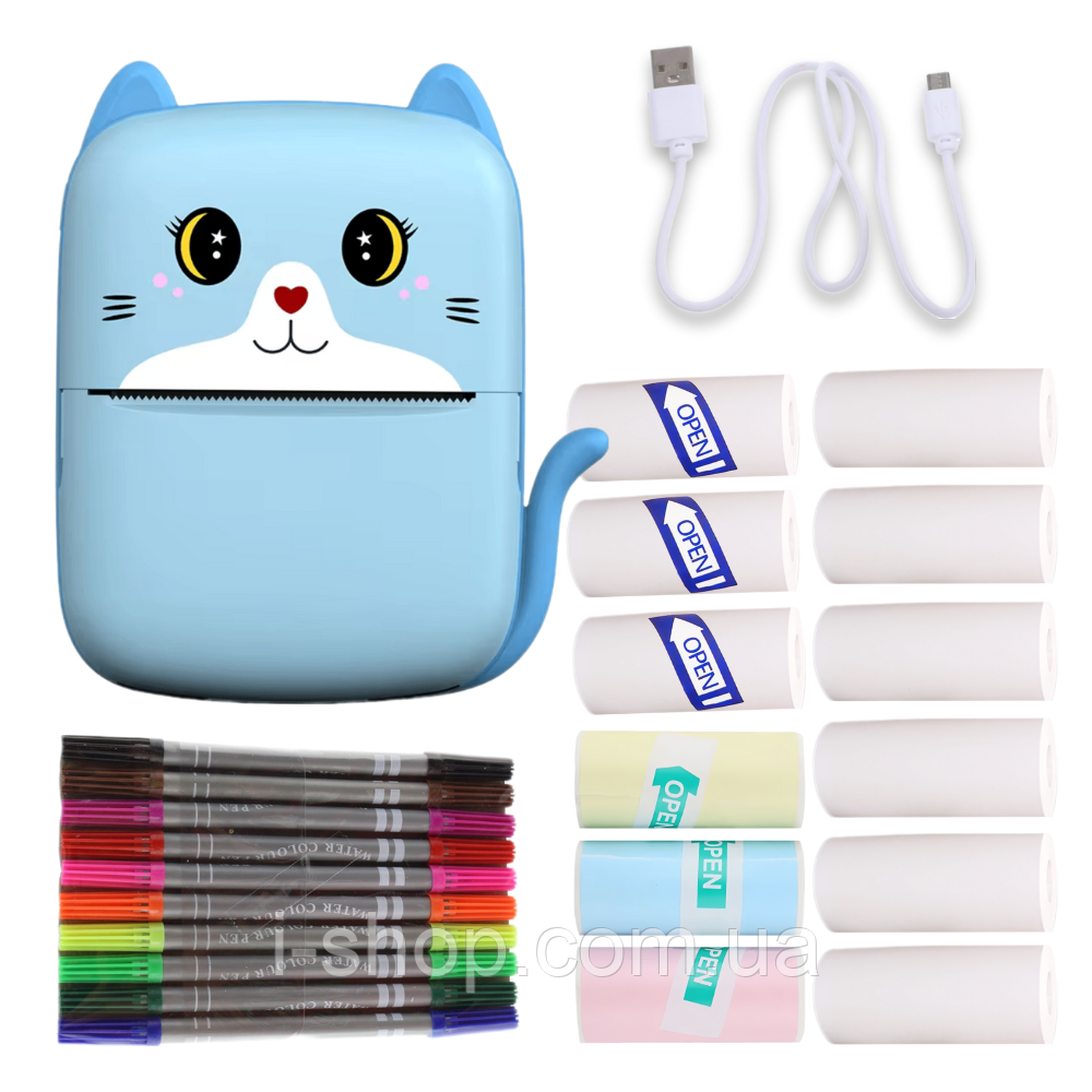 Бездротовий міні принтер Bluetooth Котик з хвостом блакитний дитячий термопринтер без чорнил для телефону 12 рулонів + фломастери
